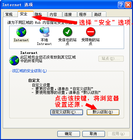 在彈出的對(duì)話框中將“安全”選項(xiàng)中設(shè)置還原為“默認(rèn)級(jí)別”